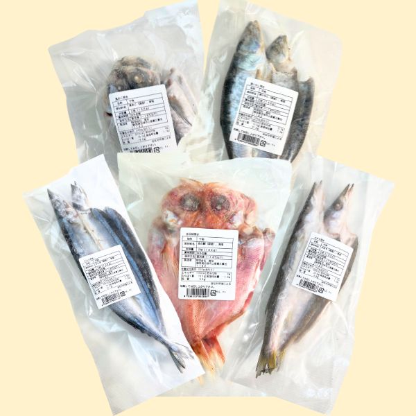 【商品説明】脂がのった時期に国内で水揚げされた新鮮なお魚をを真塩だけで調味し、冷風除湿乾燥して干物に加工しました。沖縄の真塩100%で作った塩汁(しょしる)は、約25年注ぎ足しながら使用しています。【セット内容・内容量】・真あじ開き2枚(160g)×1・かます開き2枚(160g)×1・さんま開き2枚(140g)×1・金目鯛開き2枚(160g)×1・真いわし開き2枚(140g)×1